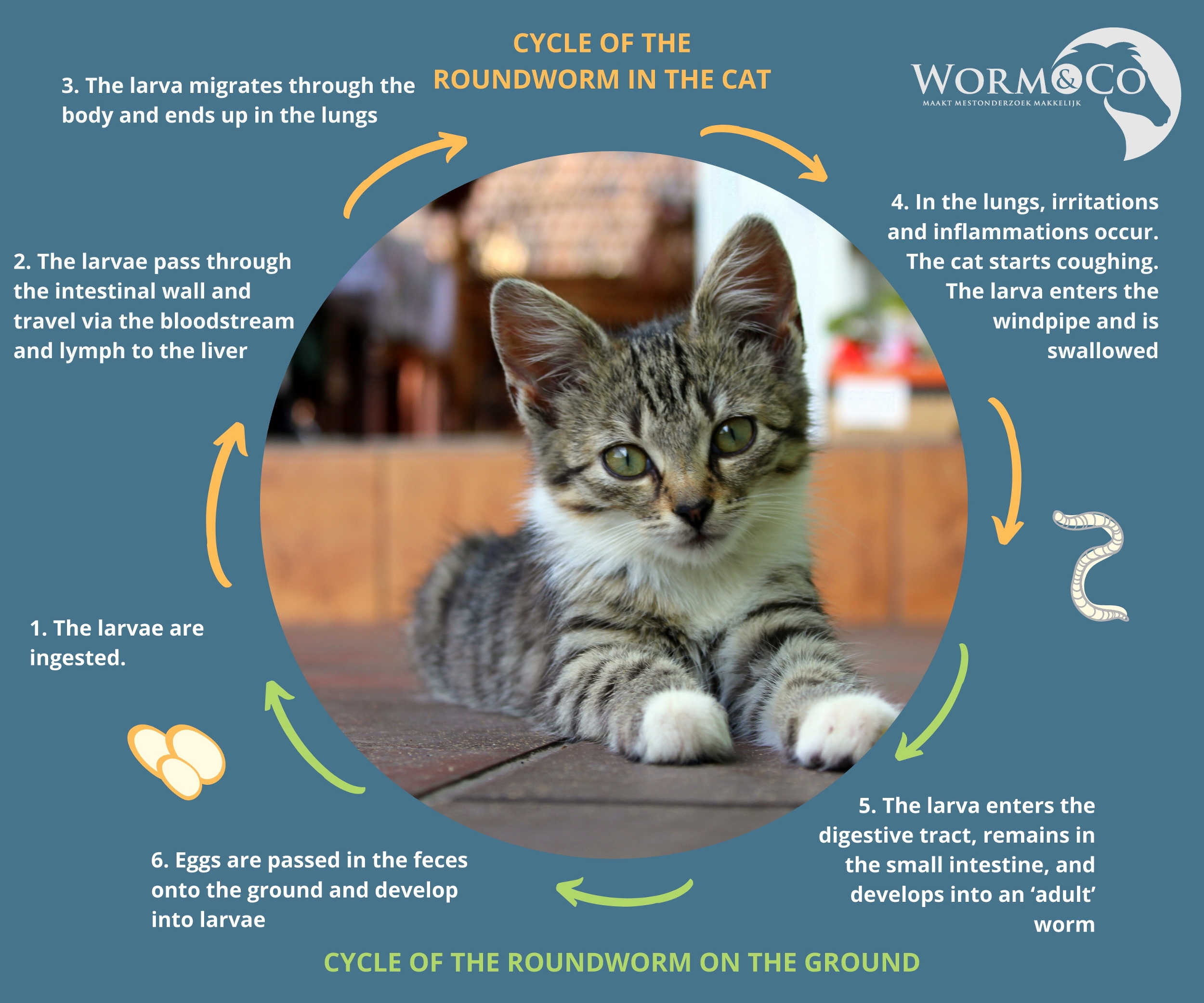 All worms have their own life cycle, but the basic process is the same. The larva is ingested by the cat and migrates through the body. Inside the body, the larva becomes a worm that lays eggs. The eggs are passed through the feces and end up on the ground. From the eggs, larvae hatch, starting the cycle all over again.