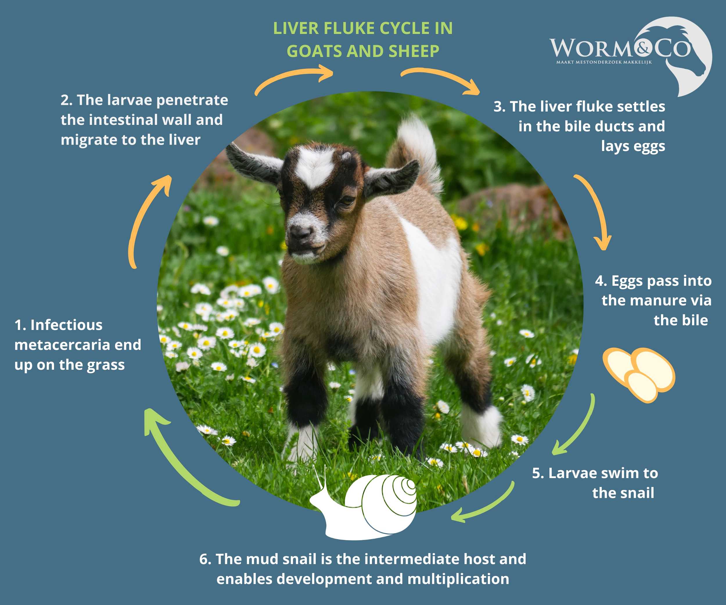Below you can see the life cycle of the liver fluke. In recent years, liver fluke infections have become increasingly common. What makes the liver fluke unique is that its larva needs an intermediate host (the mud snail) to reproduce.