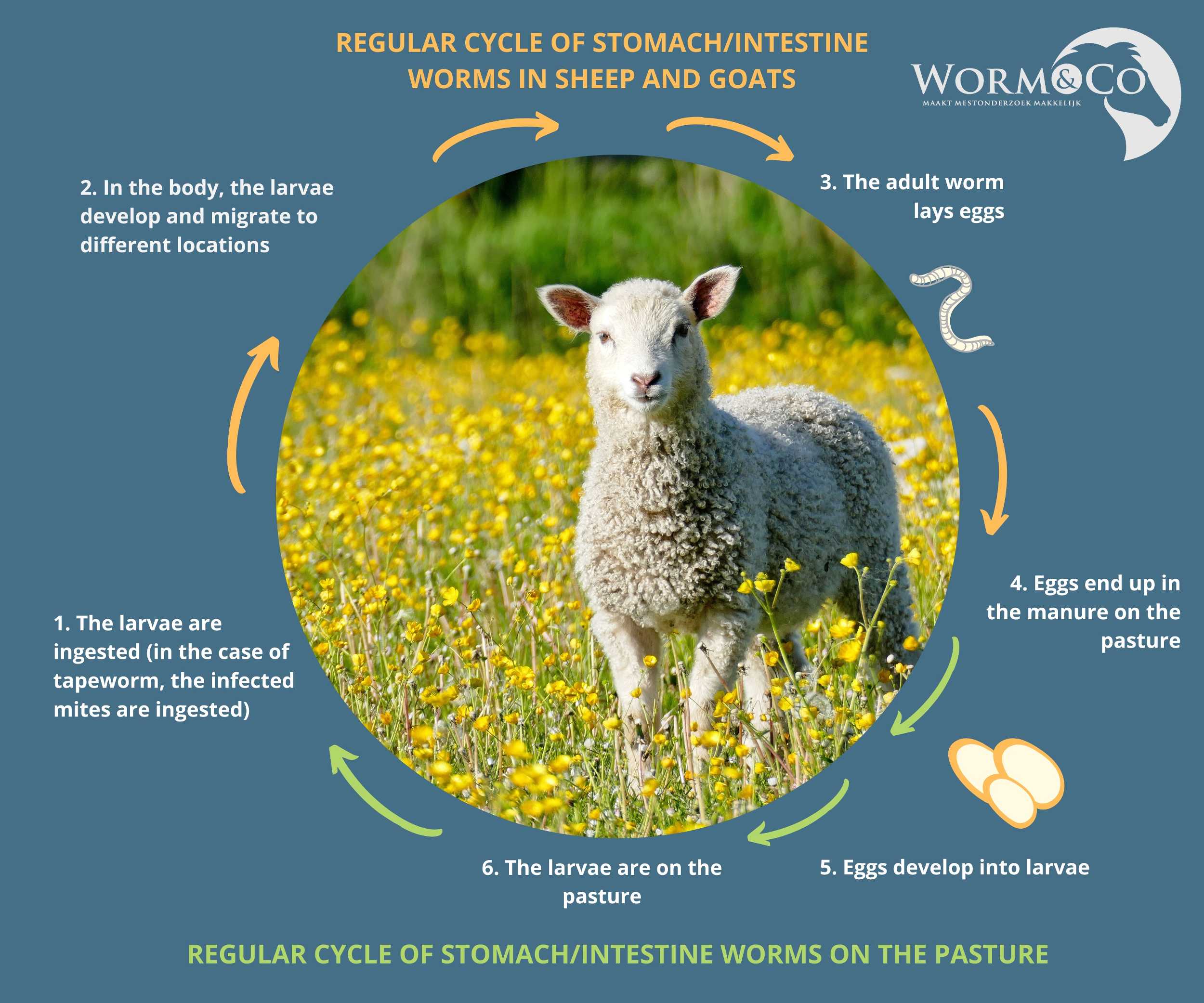 All gastrointestinal worms have their own cycle, but the basic process is the same. The larva is eaten by a goat or sheep and migrates through the body. Inside the body, the larva develops into a worm that lays eggs. The eggs end up on the pasture through the droppings. From these eggs, new larvae hatch, and the cycle starts all over again. It is therefore very important to move your animals to fresh pasture every 2 to 3 weeks to prevent (re)infection.