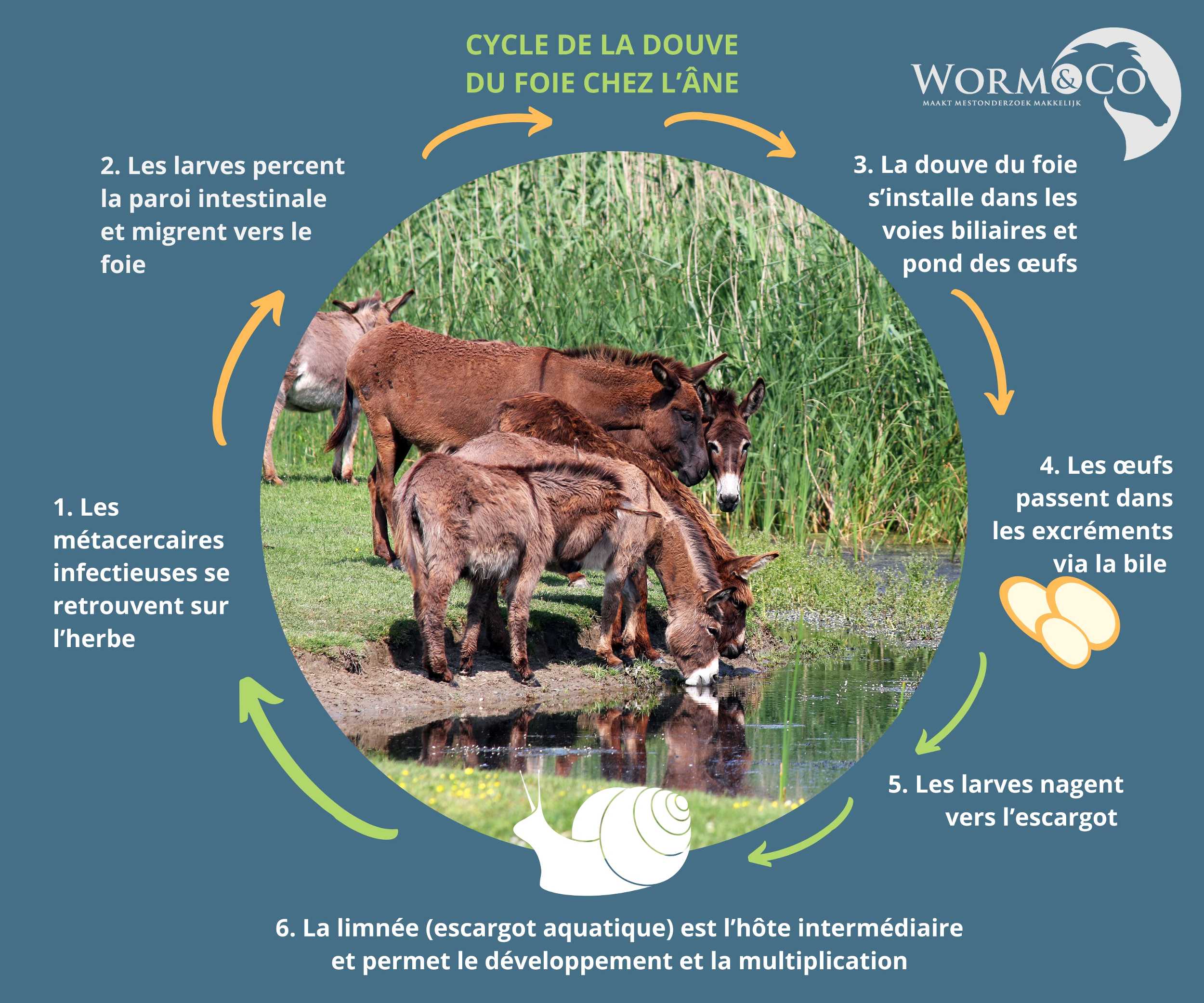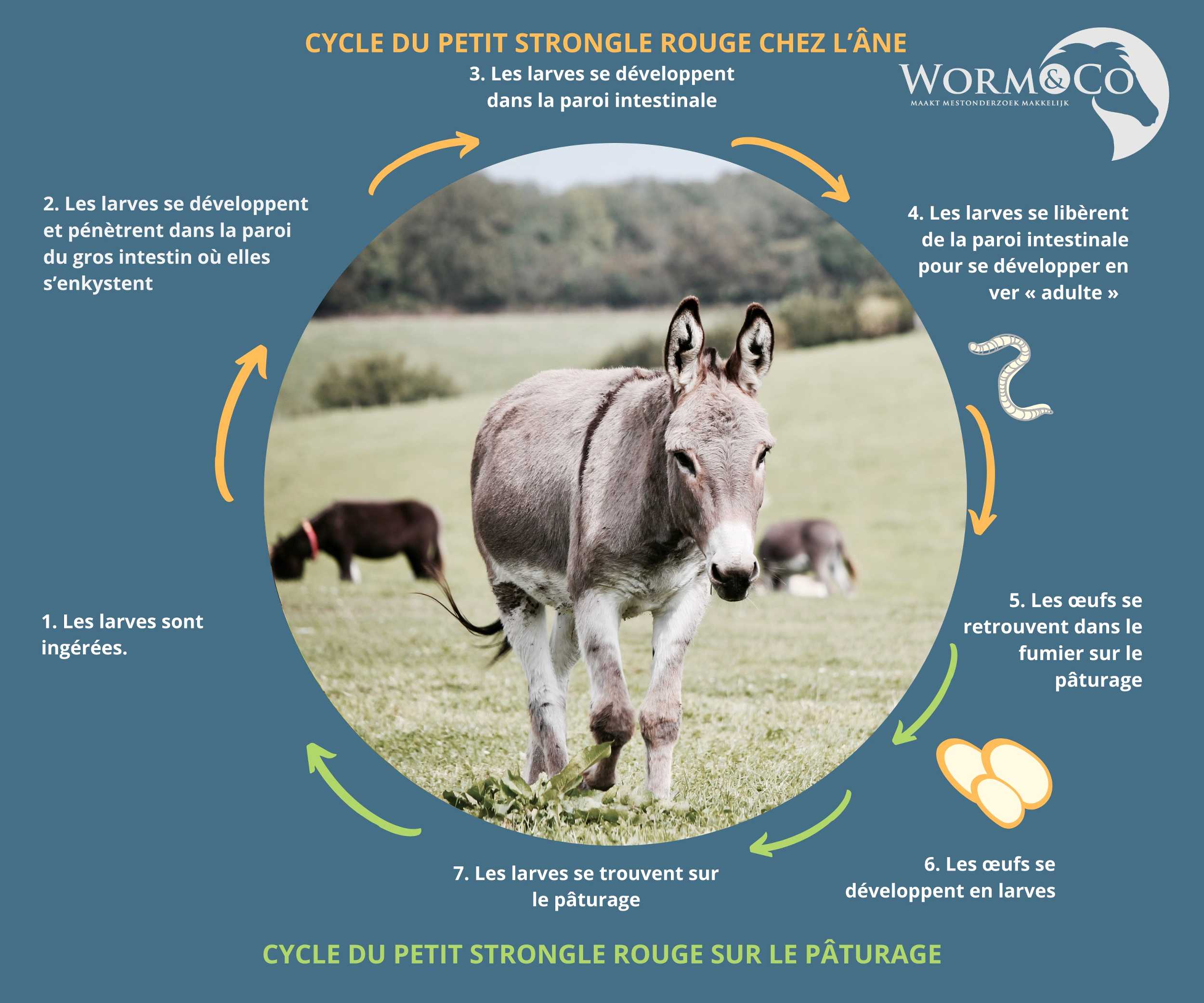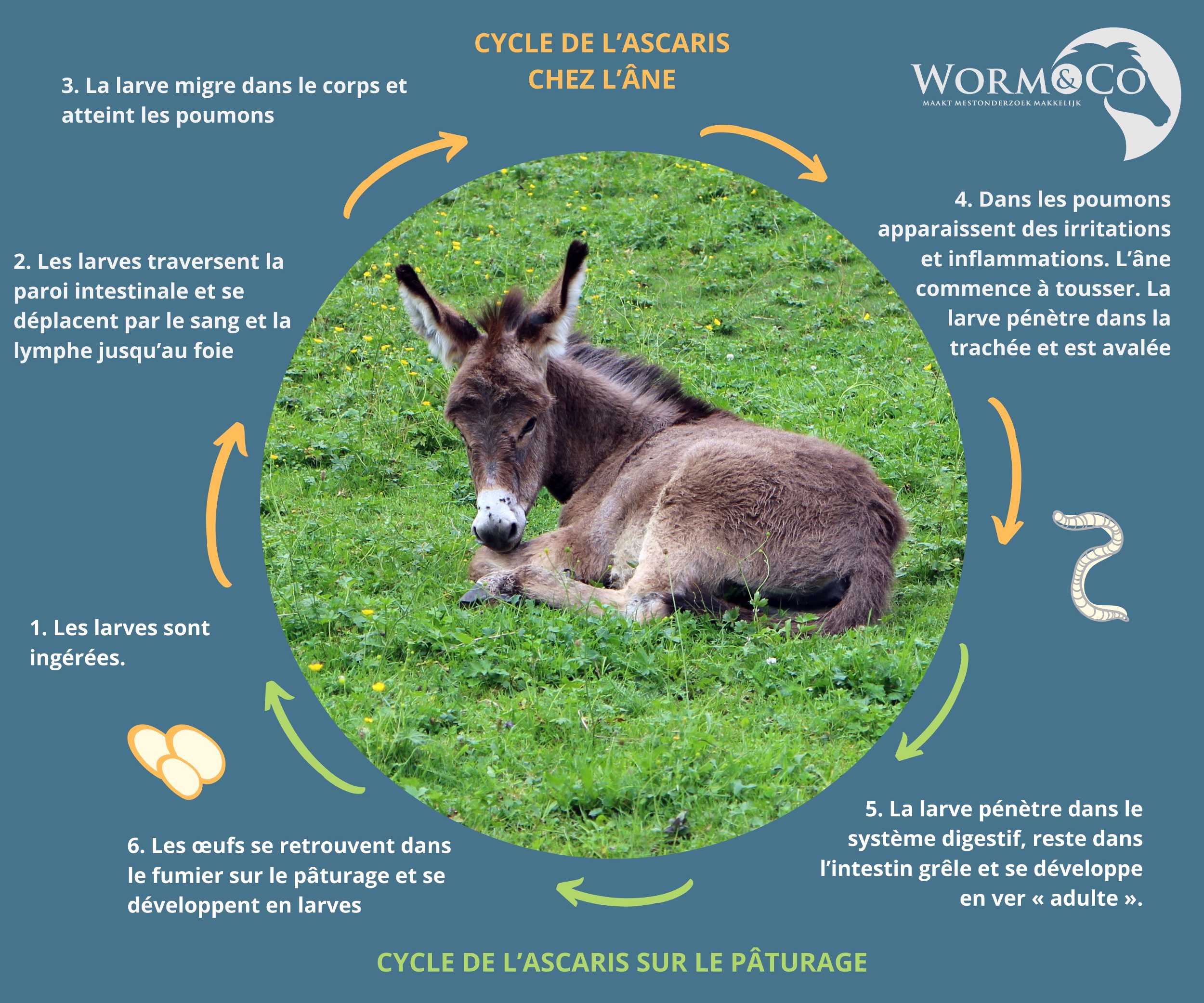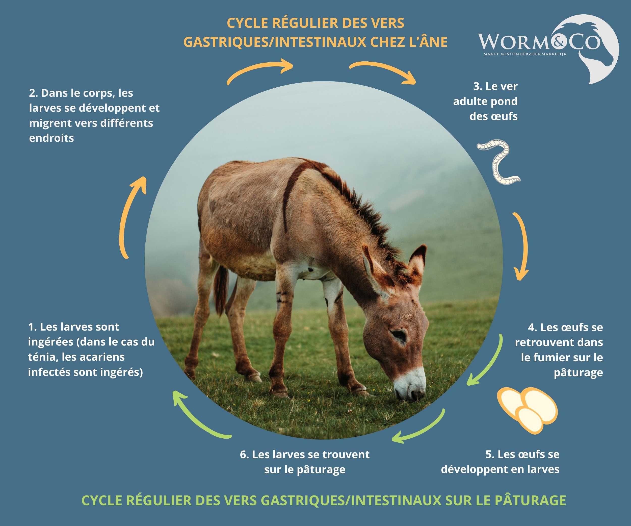 Chaque ver gastro-intestinal a son propre cycle, mais le processus de base reste le même. La larve est ingérée par l’âne et migre dans son corps. Elle se transforme ensuite en ver adulte qui pond des œufs. Les œufs sont excrétés dans les crottins et se retrouvent dans les pâturages. De ces œufs naissent de nouvelles larves, et le cycle recommence. Le retrait du fumier est donc essentiel pour éviter toute (ré)infestation.