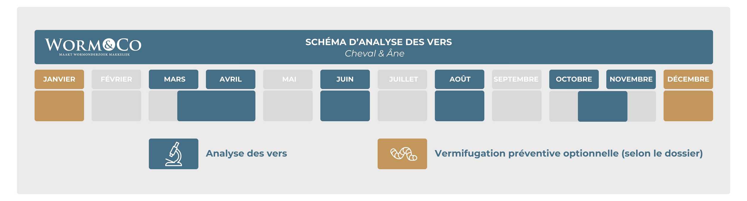 Nous vous conseillons de vermifuger une fois à titre préventif fin décembre ou début janvier. La nécessité de cette intervention dépend de plusieurs facteurs tels que l’âge, les conditions de vie et les résultats antérieurs. En fin d’année, vous recevrez un conseil personnalisé indiquant si une vermifugation préventive est recommandée pour votre(vos) âne(s).