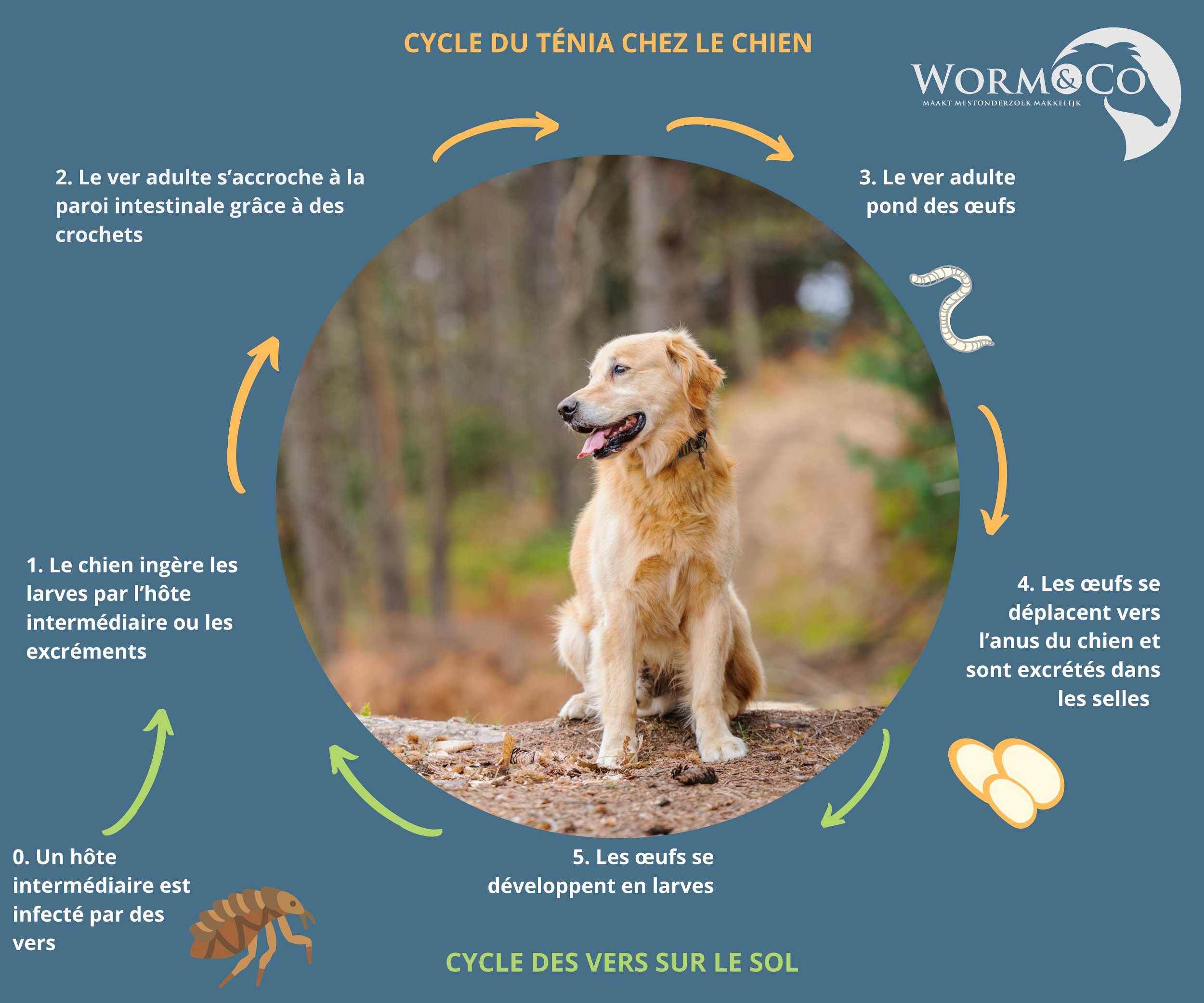 Voici le cycle du ténia. Le chien peut être infecté en mangeant ou léchant un hôte intermédiaire, ou via les excréments d'autres chiens ou de renards.
