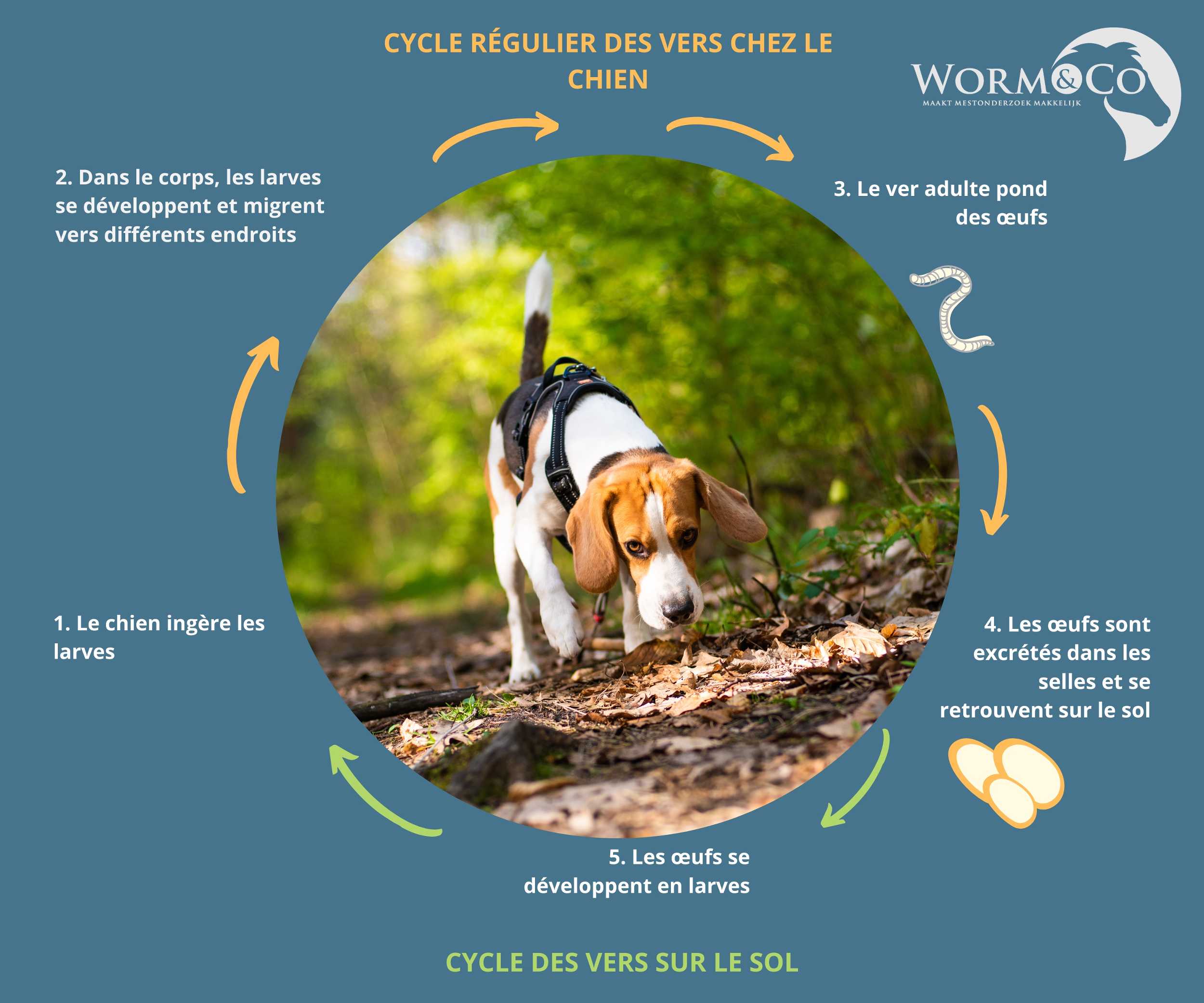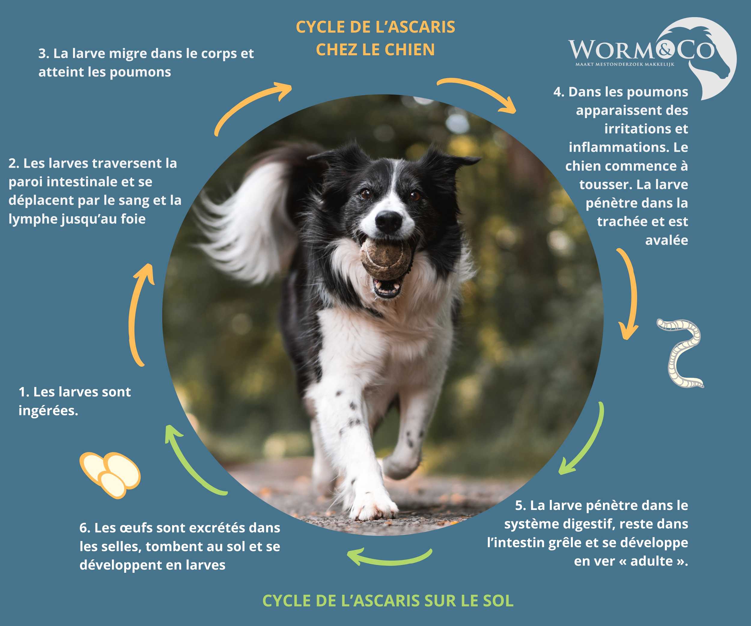 Tous les vers ont leur propre cycle de vie, mais le processus de base est le même. La larve est ingérée par le chien et migre dans le corps. Elle devient un ver adulte qui pond des œufs. Les œufs sont évacués dans les selles et tombent au sol. De ces œufs naissent de nouvelles larves, relançant ainsi le cycle.