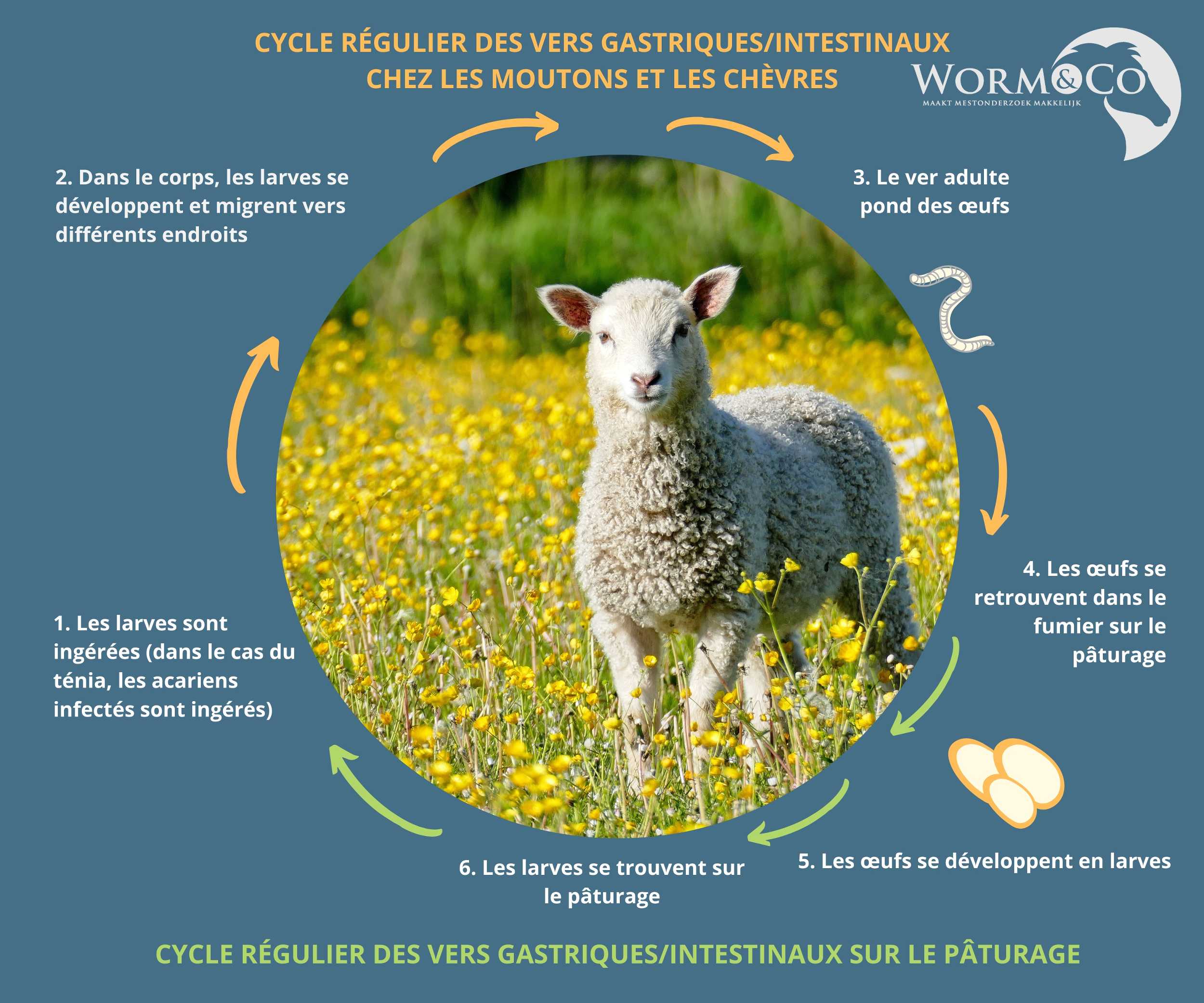 Tous les vers gastro-intestinaux ont leur propre cycle, mais le processus de base est le même. La larve est ingérée par une chèvre ou un mouton et migre dans l’organisme. Dans le corps, la larve se transforme en ver qui pond des œufs. Les œufs se retrouvent dans le pâturage via les excréments. De ces œufs éclosent de nouvelles larves, et le cycle recommence. Il est donc très important de déplacer vos animaux toutes les 2 à 3 semaines vers un nouveau pré afin d’éviter une (ré)infestation.