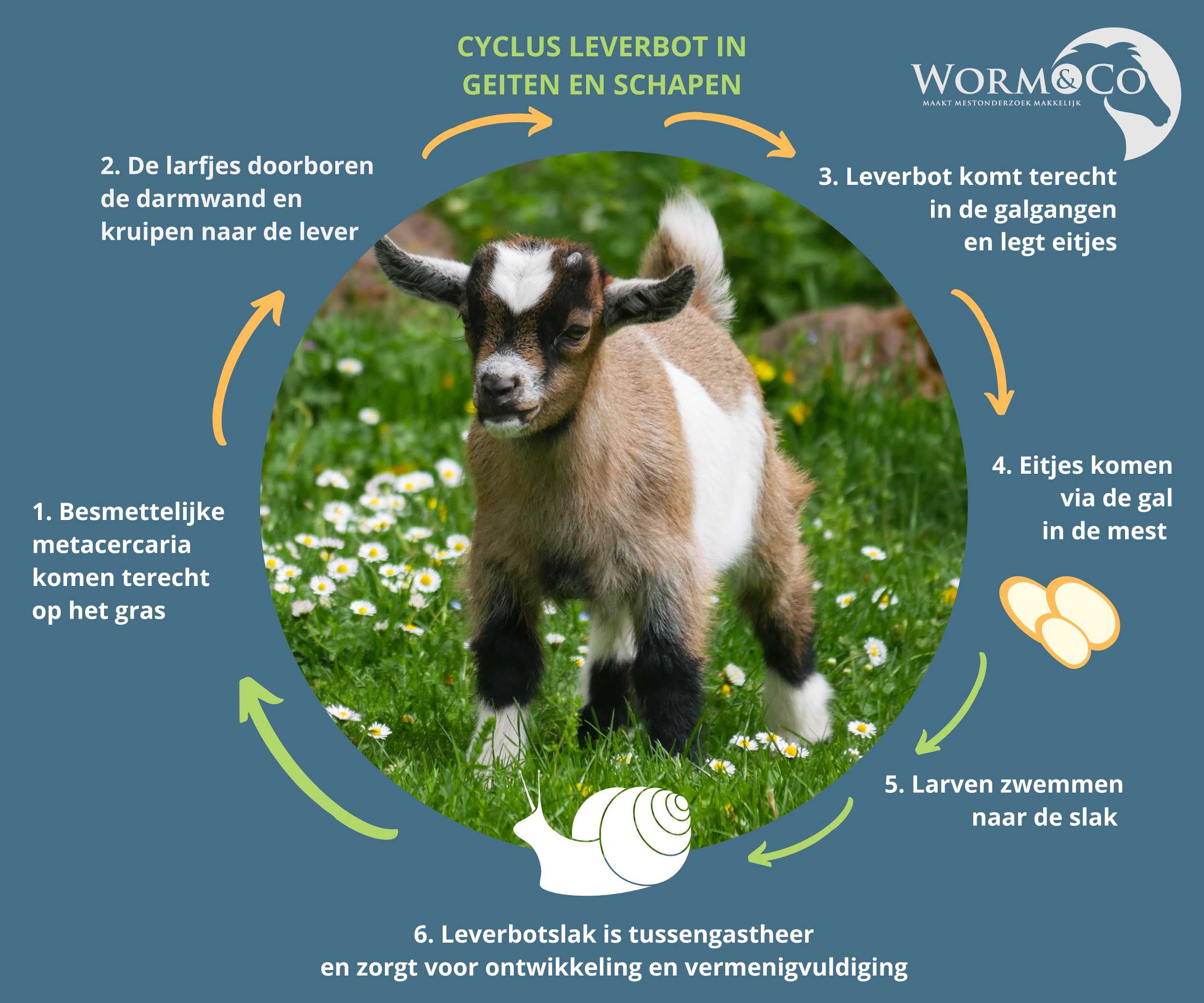 Hieronder vindt u de cyclus van de leverbot. Een leverbotbesmetting zien we de laatste jaren steeds vaker. Het unieke aan de leverbot is dat de larve een tussengastheer (de leverbotslak) nodig heeft om zich voor te planten.