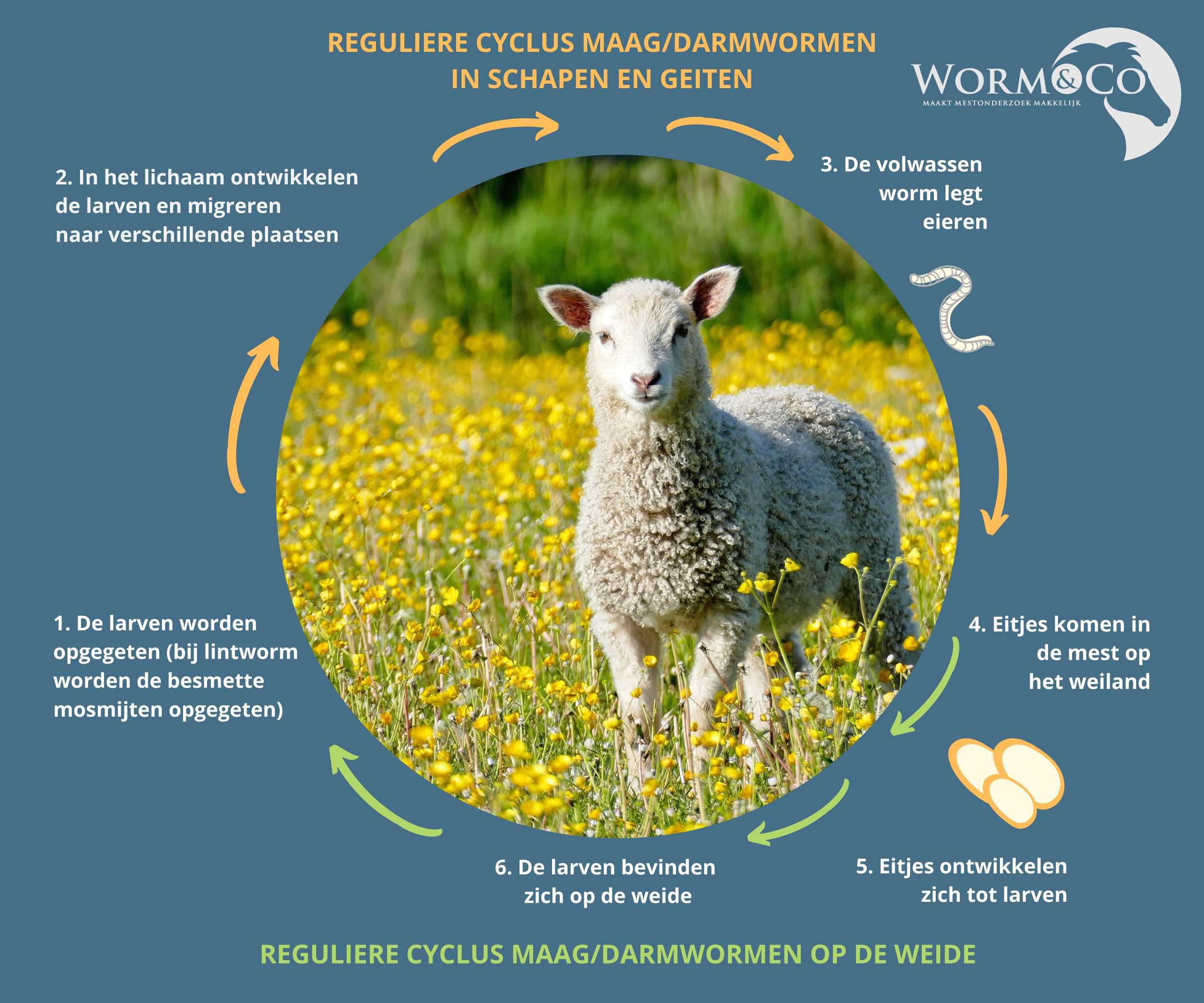 Alle maagdarmwormen hebben hun eigen cyclus, maar in de basis is het proces hetzelfde. De larve wordt opgegeten door een geit of schaap en migreert door het lichaam. In het lichaam wordt de larve een worm die eitjes legt. De eitjes komen via de ontlasting terecht op het land. Uit de eitjes komen larven, waardoor de cyclus weer vooraf begint. Het is dan ook erg belangrijk om uw dieren iedere 2 tot 3 weken te verweiden om een (her)besmetting te voorkomen.